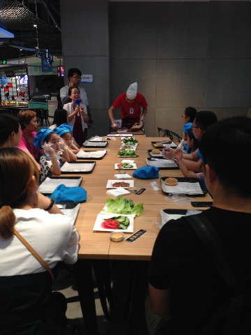 小朋友們?cè)谄啂煹默F(xiàn)場(chǎng)指導(dǎo)以及爸爸媽媽的協(xié)助下,親自動(dòng)手,做金星烤鴨漢堡??绝啙h堡制作完成后,小朋友們還意猶未盡,在工作人員的帶領(lǐng)下,參觀了金星烤鴨店,進(jìn)一步了解烤鴨文化,并合影留念。