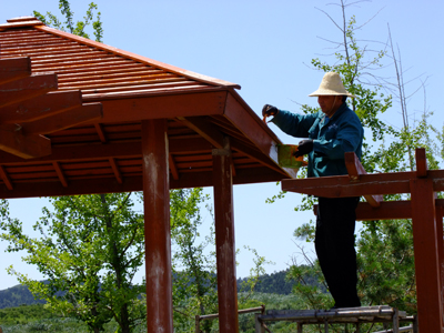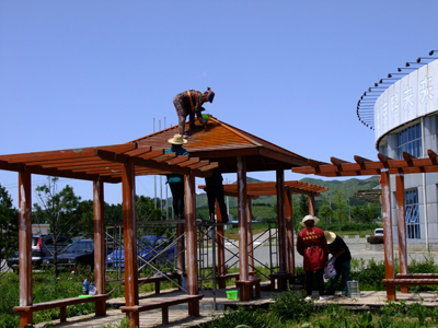 ? ? ? ? 在辦公樓旁涼亭內(nèi)小憩,頓覺神清氣爽,涼亭自此便成為員工駐足納涼的必備之處。隨著時間的推移,涼亭外表的油漆經(jīng)過風吹日曬日漸褪色,木料結(jié)合處縫隙也逐漸變大破損。為了讓員工在每日勞累的工作之余得以舒緩身心,在公司領導的支持下,后勤部人員主動承擔起對涼亭的修繕工作。