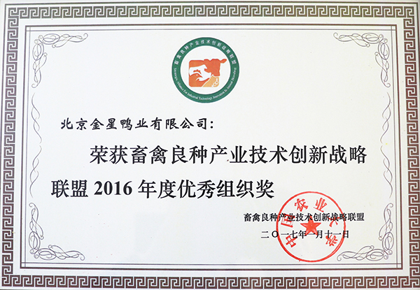 自2016年年初加入聯(lián)盟以來,金星鴨業(yè)積極支持參與聯(lián)盟工作,榮獲“2016年度優(yōu)秀組織獎(jiǎng)”。作為新成員,公司將在“十三五”期間充分利用聯(lián)盟資源,深入開展產(chǎn)學(xué)研聯(lián)合創(chuàng)新,推動(dòng)北京鴨育種事業(yè)快速發(fā)展。